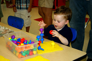 Today they had the open house for my preschool - it was so fun! I got to meet my teachers and the other kids who will be in my class. I can't WAIT to start on Tuesday! Me and Daddy - I'm ready to meet the teacher! Mommy showing me where I'll hang my backpack... Straight to work!